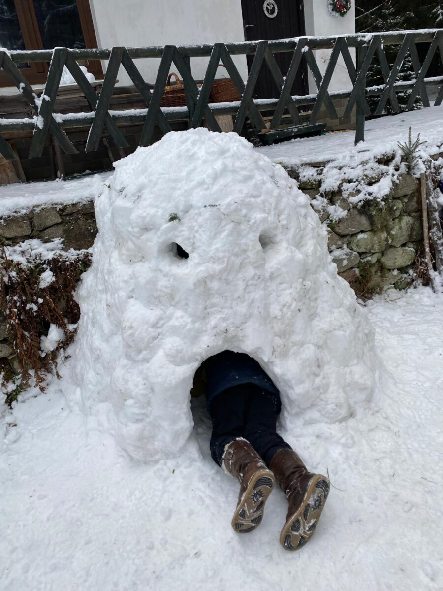 Did I mention there is no electricity here? Only a bunch of solar powered lamps and a little wooden house outside, serving as a toilet. That’s why the evenings here are spent playing board games, mostly “člověče nezlob se! “, which then ends up being thrown across the room by my cousin who is losing. Or playing a bunch of card games by a candle. And that’s how the week passes by. And faster than you would think, being without a connection to the internet or daily scrolling to pass time. And then we depart back “home”, leaving behind tracks from sledges, a family of snowmen, an empty food cabinet, and sometimes an iglu or two.